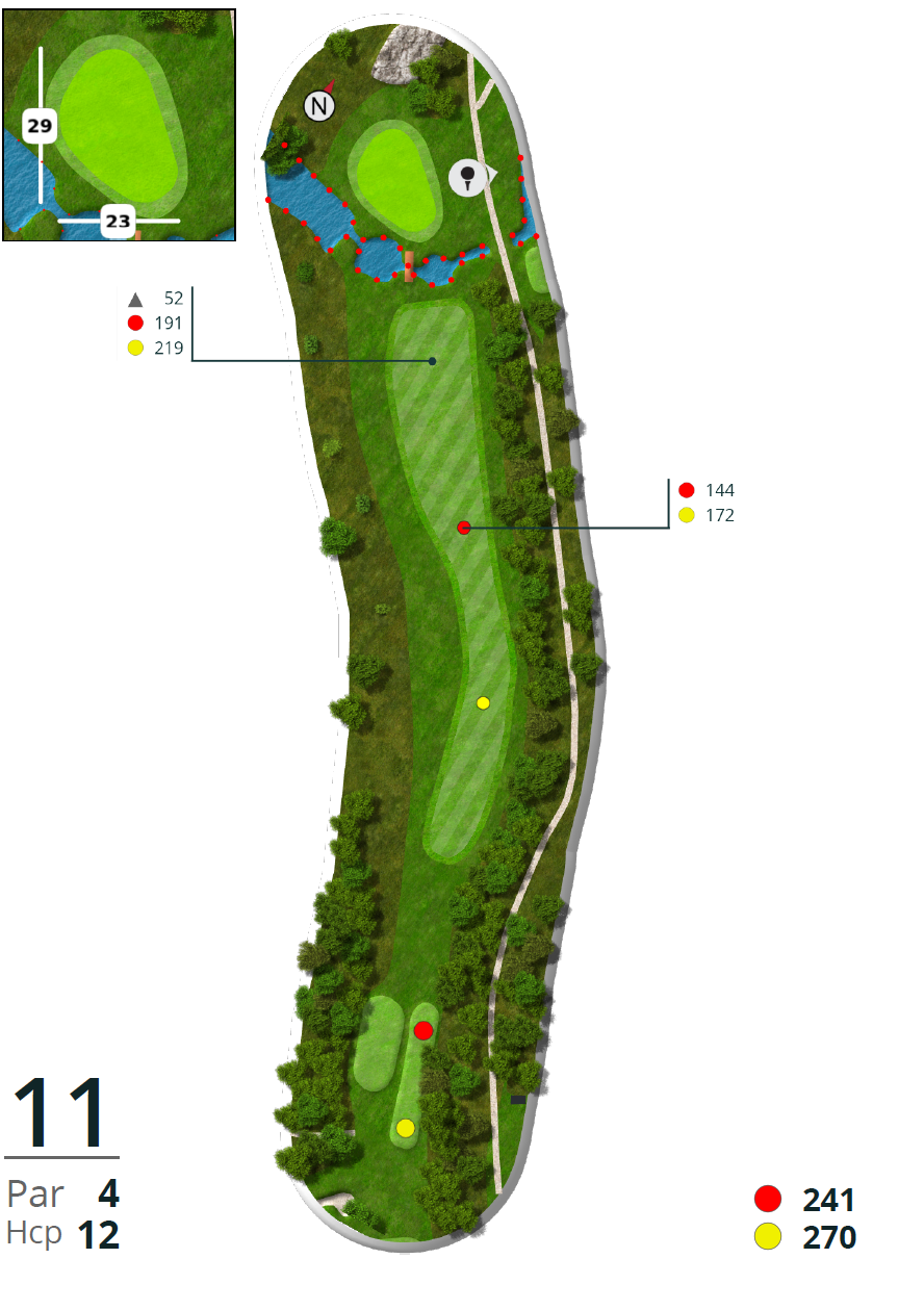 Vanskeligere enn det ser ut til. Out-of-bounds til høyre og bekk til venstre. Vann før green.