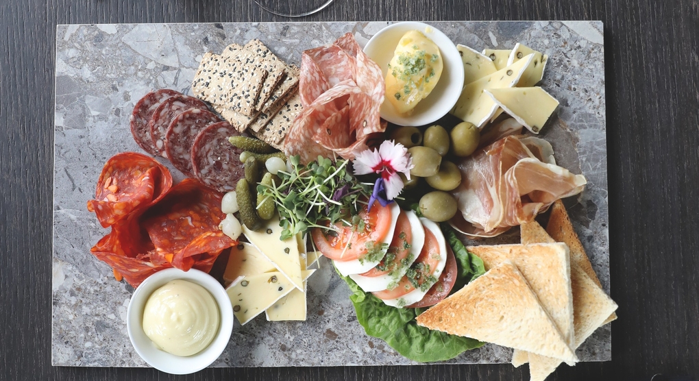 Spekeskinke, salami, ost, syltede grønnsaker, oliven, brød og smør